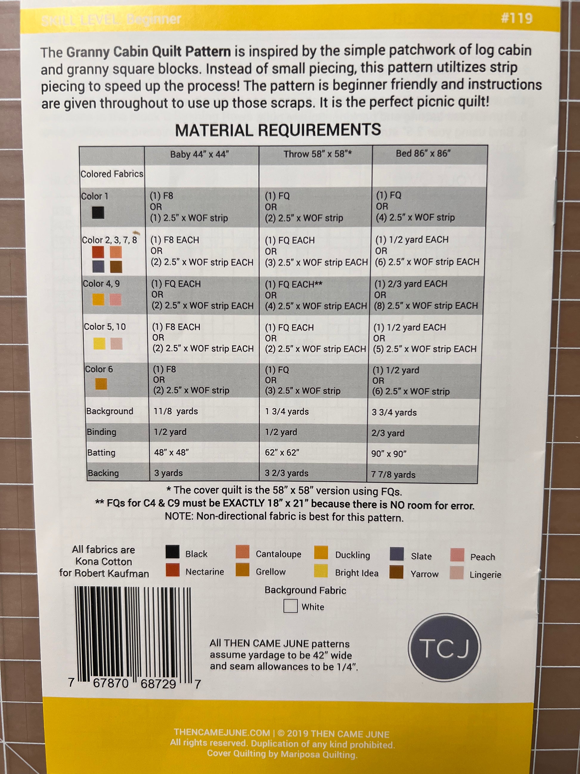 This pattern that makes a Baby (44 x 44), Throw (58 x 58) or Bed (86 x 86) size. Fat quarter, Jelly Roll, Scrap friendly.